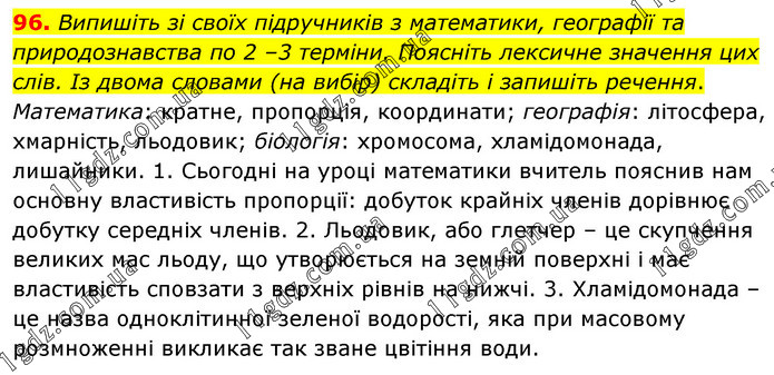 Випишіть зі своїх підручників з математики, географії та природознавства по 2 –3 терміни. Поясніть лексичне значення цих слів. Із двома словами (на вибір) складіть і запишіть речення. Математика: кратне, пропорція, координати; географія: літосфера, хмарність, льодовик; біологія: хромосома, хламідомонада, лишайники. 1. Сьогодні на уроці математики вчитель пояснив нам основну властивість пропорції: добуток крайніх членів дорівнює добутку середніх членів. 2. Льодовик, або глетчер – це скупчення великих мас льоду, що утворюється на земній поверхні і має властивість сповзати з верхніх рівнів на нижчі. 3. Хламідомонада – це назва одноклітинної зеленої водорості, яка при масовому розмноженні викликає так зване цвітіння води.