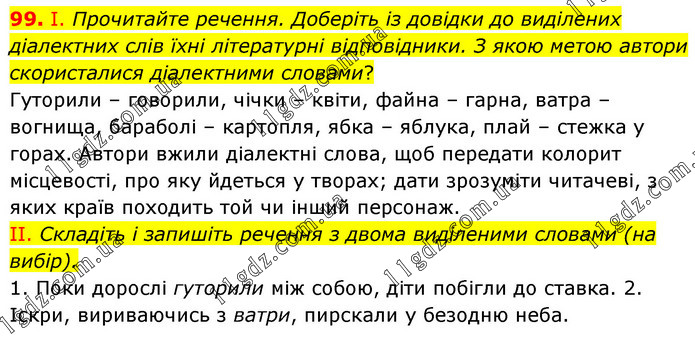 І. Прочитайте речення. Доберіть із довідки до виділених діалектних слів їхні літературні відповідники. З якою метою автори скористалися діалектними словами? Гуторили – говорили, чічки – квіти, файна – гарна, ватра – вогнища, бараболі – картопля, ябка – яблука, плай – стежка у горах. Автори вжили діалектні слова, щоб передати колорит місцевості, про яку йдеться у творах; дати зрозуміти читачеві, з яких країв походить той чи інший персонаж. ІІ. Складіть і запишіть речення з двома виділеними словами (на вибір). 1. Поки дорослі гуторили між собою, діти побігли до ставка. 2. Іскри, вириваючись з ватри, пирскали у безодню неба.
