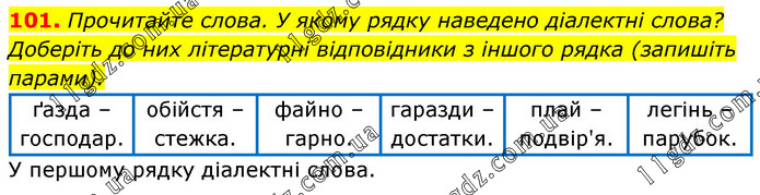 Прочитайте слова. У якому рядку наведено діалектні слова? Доберіть до них літературні відповідники з іншого рядка (запишіть парами). ґазда – господар. обійстя – стежка. файно – гарно. гаразди – достатки. плай –подвір'я. легінь – парубок. У першому рядку діалектні слова.