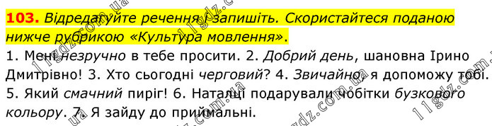 Відредагуйте речення і запишіть. Скористайтеся поданою нижче рубрикою «Культура мовлення». 1. Мені незручно в тебе просити. 2. Добрий день, шановна Ірино Дмитрівно! 3. Хто сьогодні черговий? 4. Звичайно, я допоможу тобі. 5. Який смачний пиріг! 6. Наталці подарували чобітки бузкового кольору. 7. Я зайду до приймальні.