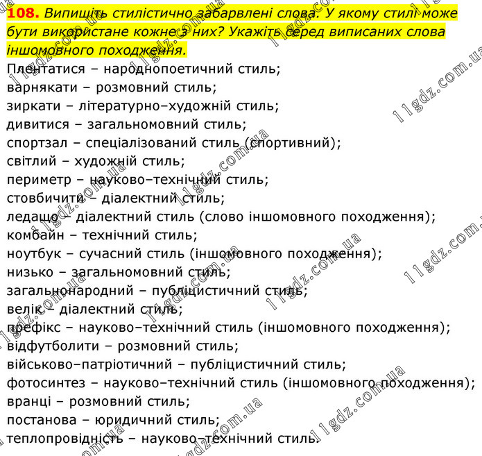 Випишіть стилістично забарвлені слова. У якому стилі може бути використане кожне з них? Укажіть серед виписаних слова іншомовного походження. Плентатися – народнопоетичний стиль; варнякати – розмовний стиль; зиркати – літературно–художній стиль; дивитися – загальномовний стиль; спортзал – спеціалізований стиль (спортивний); світлий – художній стиль; периметр – науково–технічний стиль; стовбичити – діалектний стиль; ледащо – діалектний стиль (слово іншомовного походження); комбайн – технічний стиль; ноутбук – сучасний стиль (іншомовного походження); низько – загальномовний стиль; загальнонародний – публіцистичний стиль; велік – діалектний стиль; префікс – науково–технічний стиль (іншомовного походження); відфутболити – розмовний стиль; військово–патріотичний – публіцистичний стиль; фотосинтез – науково–технічний стиль (іншомовного походження); вранці – розмовний стиль; постанова – юридичний стиль; теплопровідність – науково–технічний стиль.