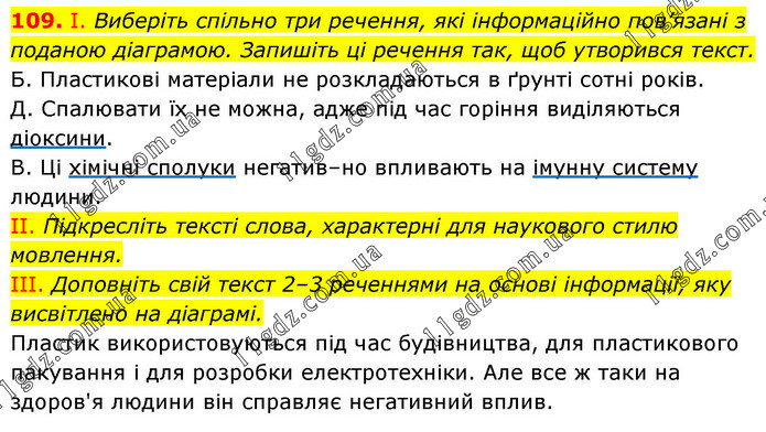 І. Виберіть спільно три речення, які інформаційно пов’язані з поданою діаграмою. Запишіть ці речення так, щоб утворився текст. Б. Пластикові матеріали не розкладаються в ґрунті сотні років. Д. Спалювати їх не можна, адже під час горіння виділяються діоксини. В. Ці хімічні сполуки негатив–но впливають на імунну систему людини. II. Підкресліть тексті слова, характерні для наукового стилю мовлення. III. Доповніть свій текст 2–3 реченнями на основі інформації, яку висвітлено на діаграмі. Пластик використовуються під час будівництва, для пластикового пакування і для розробки електротехніки. Але все ж таки на здоров'я людини він справляє негативний вплив.