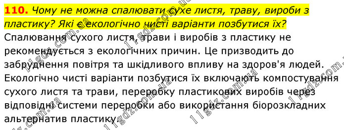 Чому не можна спалювати сухе листя, траву, вироби з пластику? Які є екологічно чисті варіанти позбутися їх? Спалювання сухого листя, трави і виробів з пластику не рекомендується з екологічних причин. Це призводить до забруднення повітря та шкідливого впливу на здоров'я людей. Екологічно чисті варіанти позбутися їх включають компостування сухого листя та трави, переробку пластикових виробів через відповідні системи переробки або використання біорозкладних альтернатив пластику.