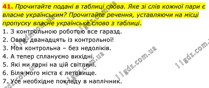 Прочитайте подані в таблиці слова. Яке зі слів кожної пари є власне українським? Прочитайте речення, уставляючи на місці пропуску власне українське слово з таблиці. 1. З контрольною роботою все гаразд. 2. Овва, дванадцять із контрольної! 3. Моя контрольна – без недоліків. 4. А тепер сплануємо вихідні. 5. Які ми гарні на цій світлині. 6. Біля мого міста є летовище. 7. Усе необхідне покладу в наплічник.