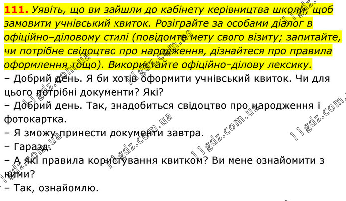 Уявіть, що ви зайшли до кабінету керівництва школи, щоб замовити учнівський квиток. Розіграйте за особами діалог в офіційно–діловому стилі (повідомте мету свого візиту; запитайте, чи потрібне свідоцтво про народження, дізнайтеся про правила оформлення тощо). Використайте офіційно–ділову лексику. – Добрий день. Я би хотів оформити учнівський квиток. Чи для цього потрібні документи? Які? – Добрий день. Так, знадобиться свідоцтво про народження і фотокартка. – Я зможу принести документи завтра. – Гаразд. – А які правила користування квитком? Ви мене ознайомити з ними? – Так, ознайомлю.