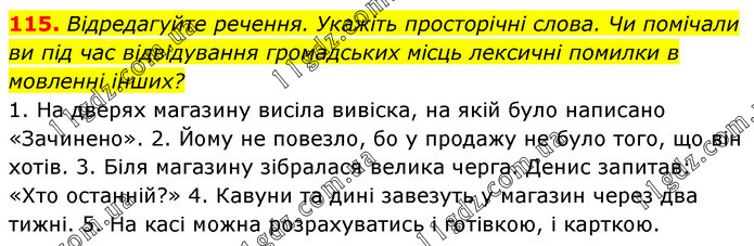Відредагуйте речення. Укажіть просторічні слова. Чи помічали ви під час відвідування громадських місць лексичні помилки в мовленні інших? 1. На дверях магазину висіла вивіска, на якій було написано «Зачинено». 2. Йому не повезло, бо у продажу не було того, що він хотів. 3. Біля магазину зібралася велика черга. Денис запитав: «Хто останній?» 4. Кавуни та дині завезуть у магазин через два тижні. 5. На касі можна розрахуватись і готівкою, і карткою.