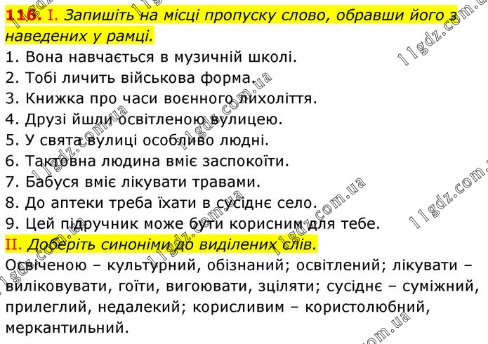 І. Запишіть на місці пропуску слово, обравши його з наведених у рамці. 1. Вона навчається в музичній школі. 2. Тобі личить військова форма. 3. Книжка про часи воєнного лихоліття. 4. Друзі йшли освітленою вулицею. 5. У свята вулиці особливо людні. 6. Тактовна людина вміє заспокоїти. 7. Бабуся вміє лікувати травами. 8. До аптеки треба їхати в сусіднє село. 9. Цей підручник може бути корисним для тебе. II. Доберіть синоніми до виділених слів. Освіченою – культурний, обізнаний; освітлений; лікувати – виліковувати, гоїти, вигоювати, зціляти; сусіднє – суміжний, прилеглий, недалекий; корисливим – користолюбний, меркантильний.