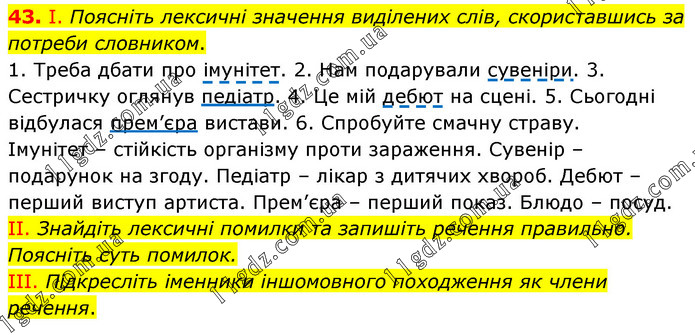 І. Поясніть лексичні значення виділених слів, скориставшись за потреби словником. 1. Треба дбати про імунітет. 2. Нам подарували сувеніри. 3. Сестричку оглянув педіатр. 4. Це мій дебют на сцені. 5. Сьогодні відбулася прем’єра вистави. 6. Спробуйте смачну страву. Імунітет – стійкість організму проти зараження. Сувенір – подарунок на згоду. Педіатр – лікар з дитячих хвороб. Дебют – перший виступ артиста. Прем’єра – перший показ. Блюдо – посуд. II. Знайдіть лексичні помилки та запишіть речення правильно. Поясніть суть помилок. III. Підкресліть іменники іншомовного походження як члени речення.