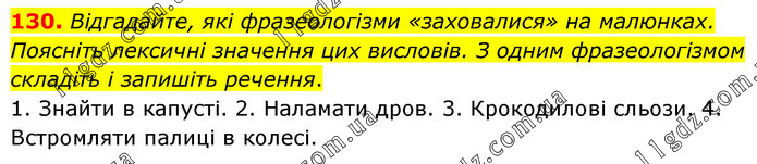 Відгадайте, які фразеологізми «заховалися» на малюнках. Поясніть лексичні значення цих висловів. З одним фразеологізмом складіть і запишіть речення. 1. Знайти в капусті. 2. Наламати дров. 3. Крокодилові сльози. 4. Встромляти палиці в колесі.