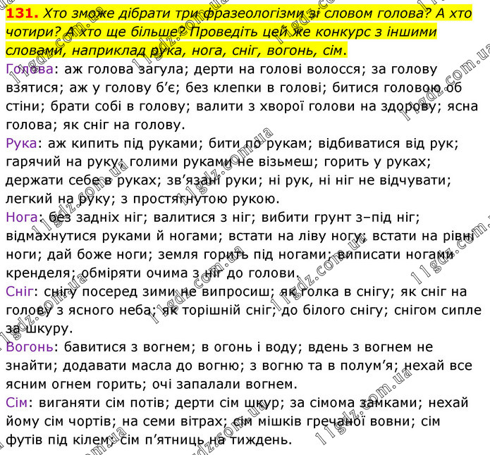 Хто зможе дібрати три фразеологізми зі словом голова? А хто чотири? А хто ще більше? Проведіть цей же конкурс з іншими словами, наприклад рука, нога, сніг, вогонь, сім. Голова: аж голова загула; дерти на голові волосся; за голову взятися; аж у голову б’є; без клепки в голові; битися головою об стіни; брати собі в голову; валити з хворої голови на здорову; ясна голова; як сніг на голову. Рука: аж кипить під руками; бити по рукам; відбиватися від рук; гарячий на руку; голими руками не візьмеш; горить у руках; держати себе в руках; зв’язані руки; ні рук, ні ніг не відчувати; легкий на руку; з простягнутою рукою. Нога: без задніх ніг; валитися з ніг; вибити грунт з–під ніг; відмахнутися руками й ногами; встати на ліву ногу; встати на рівні ноги; дай боже ноги; земля горить під ногами; виписати ногами кренделя; обміряти очима з ніг до голови. Сніг: снігу посеред зими не випросиш; як голка в снігу; як сніг на голову з ясного неба; як торішній сніг; до білого снігу; снігом сипле за шкуру. Вогонь: бавитися з вогнем; в огонь і воду; вдень з вогнем не знайти; додавати масла до вогню; з вогню та в полум’я; нехай все ясним огнем горить; очі запалали вогнем. Сім: виганяти сім потів; дерти сім шкур; за сімома замками; нехай йому сім чортів; на семи вітрах; сім мішків гречаної вовни; сім футів під кілем; сім п’ятниць на тиждень.