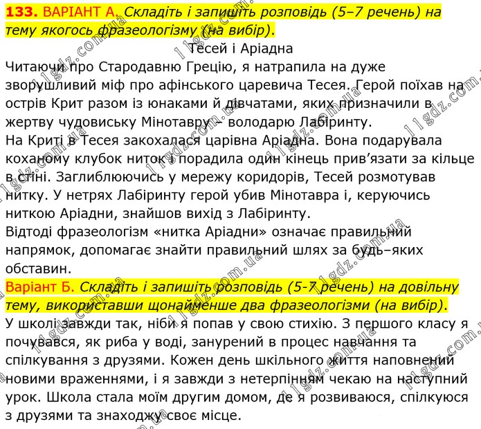 ВАРІАНТ А. Складіть і запишіть розповідь (5–7 речень) на тему якогось фразеологізму (на вибір). Тесей і Аріадна Читаючи про Стародавню Грецію, я натрапила на дуже зворушливий міф про афінського царевича Тесея. Герой поїхав на острів Крит разом із юнаками й дівчатами, яких призначили в жертву чудовиську Мінотавру – володарю Лабіринту. На Криті в Тесея закохалася царівна Аріадна. Вона подарувала коханому клубок ниток і порадила один кінець прив’язати за кільце в стіні. Заглиблюючись у мережу коридорів, Тесей розмотував нитку. У нетрях Лабіринту герой убив Мінотавра і, керуючись ниткою Аріадни, знайшов вихід з Лабіринту. Відтоді фразеологізм «нитка Аріадни» означає правильний напрямок, допомагає знайти правильний шлях за будь–яких обставин. Варіант Б. Складіть і запишіть розповідь (5-7 речень) на довільну тему, використавши щонайменше два фразеологізми (на вибір). У школі завжди так, ніби я попав у свою стихію. З першого класу я почувався, як риба у воді, занурений в процес навчання та спілкування з друзями. Кожен день шкільного життя наповнений новими враженнями, і я завжди з нетерпінням чекаю на наступний урок. Школа стала моїм другим домом, де я розвиваюся, спілкуюся з друзями та знаходжу своє місце.