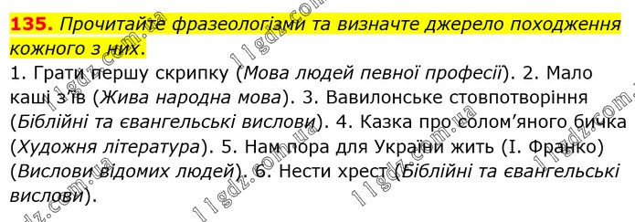 Прочитайте фразеологізми та визначте джерело походження кожного з них. 1. Грати першу скрипку (Мова людей певної професії). 2. Мало каші з’їв (Жива народна мова). 3. Вавилонське стовпотворіння (Біблійні та євангельські вислови). 4. Казка про солом’яного бичка (Художня література). 5. Нам пора для України жить (І. Франко) (Вислови відомих людей). 6. Нести хрест (Біблійні та євангельські вислови).