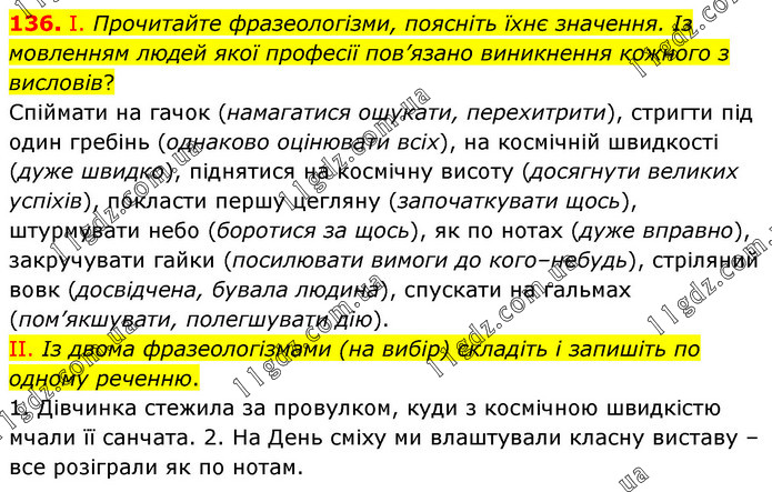 І. Прочитайте фразеологізми, поясніть їхнє значення. Із мовленням людей якої професії пов’язано виникнення кожного з висловів? Спіймати на гачок (намагатися ошукати, перехитрити), стригти під один гребінь (однаково оцінювати всіх), на космічній швидкості (дуже швидко), піднятися на космічну висоту (досягнути великих успіхів), покласти першу цегляну (започаткувати щось), штурмувати небо (боротися за щось), як по нотах (дуже вправно), закручувати гайки (посилювати вимоги до кого–небудь), стріляний вовк (досвідчена, бувала людина), спускати на гальмах (пом’якшувати, полегшувати дію). ІІ. Із двома фразеологізмами (на вибір) складіть і запишіть по одному реченню. 1. Дівчинка стежила за провулком, куди з космічною швидкістю мчали її санчата. 2. На День сміху ми влаштували класну виставу – все розіграли як по нотам.