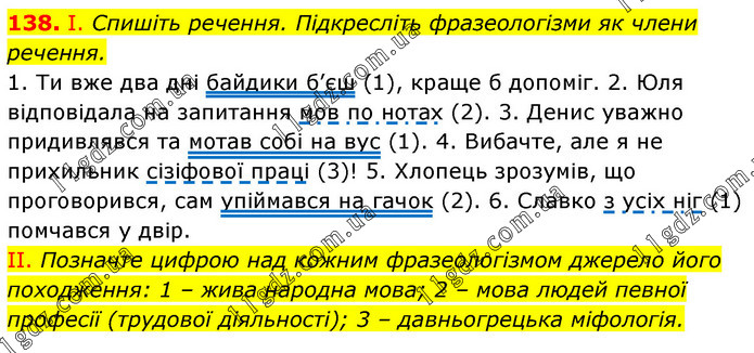І. Спишіть речення. Підкресліть фразеологізми як члени речення. 1. Ти вже два дні байдики б’єш (1), краще б допоміг. 2. Юля відповідала на запитання мов по нотах (2). 3. Денис уважно придивлявся та мотав собі на вус (1). 4. Вибачте, але я не прихильник сізіфової праці (3)! 5. Хлопець зрозумів, що проговорився, сам упіймався на гачок (2). 6. Славко з усіх ніг (1) помчався у двір. II. Позначте цифрою над кожним фразеологізмом джерело його походження: 1 – жива народна мова; 2 – мова людей певної професії (трудової діяльності); 3 – давньогрецька міфологія.