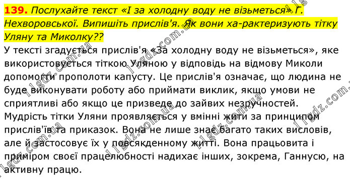 Послухайте текст «І за холодну воду не візьметься» Г. Нехворовської. Випишіть прислів'я. Як вони характеризують тітку Уляну та Миколку?? У тексті згадується прислів'я «За холодну воду не візьметься», яке використовується тіткою Уляною у відповідь на відмову Миколи допомогти прополоти капусту. Це прислів'я означає, що людина не буде виконувати роботу або приймати виклик, якщо умови не сприятливі або якщо це призведе до зайвих незручностей. Мудрість тітки Уляни проявляється у вмінні жити за принципом прислів'їв та приказок. Вона не лише знає багато таких висловів, але й застосовує їх у повсякденному житті. Вона працьовита і приміром своєї працелюбності надихає інших, зокрема, Ганнусю, на активну працю.