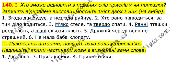 І. Хто зможе відновити з поданих слів прислів’я чи приказки? Запишіть відновлені вислови. Поясніть зміст двох з них (на вибір). 1. Згода дім будує, а незгода руйнує. 2. Хто рано підводиться, за тим діло водиться. 3. М’яко стеле, та твердо спати. 4. Ранні пташки росу п’ють, а пізні сльози ллють. 5. Дружній череді вовк не страшний. 6. Не мала баба клопоту. ІІ. Підкресліть антоніми, поясніть їхню роль у прислів’ях. Надпишіть, якими частинами мови є визначені вами слова. 1. Дієслова. 3. Прислівники. 4. Прикметники.