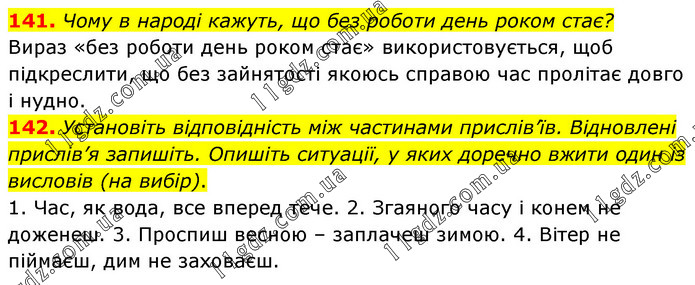 141. Чому в народі кажуть, що без роботи день роком стає? Вираз «без роботи день роком стає» використовується, щоб підкреслити, що без зайнятості якоюсь справою час пролітає довго і нудно. 142. Установіть відповідність між частинами прислів’їв. Відновлені прислів’я запишіть. Опишіть ситуації, у яких доречно вжити один із висловів (на вибір). 1. Час, як вода, все вперед тече. 2. Згаяного часу і конем не доженеш. 3. Проспиш весною – заплачеш зимою. 4. Вітер не піймаєш, дим не заховаєш.