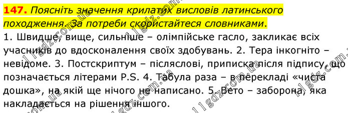 Поясніть значення крилатих висловів латинського походження. За потреби скористайтеся словниками. 1. Швидше, вище, сильніше – олімпійське гасло, закликає всіх учасників до вдосконалення своїх здобувань. 2. Тера інкогніто – невідоме. 3. Постскриптум – післяслові, приписка після підпису, що позначається літерами P.S. 4. Табула раза – в перекладі «чиста дошка», на якій ще нічого не написано. 5. Вето – заборона, яка накладається на рішення іншого.