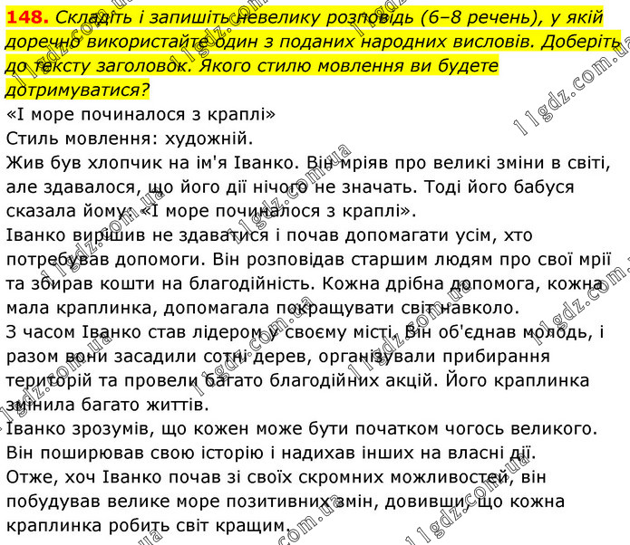 Складіть і запишіть невелику розповідь (6–8 речень), у якій доречно використайте один з поданих народних висловів. Доберіть до тексту заголовок. Якого стилю мовлення ви будете дотримуватися? «І море починалося з краплі» Стиль мовлення: художній. Жив був хлопчик на ім'я Іванко. Він мріяв про великі зміни в світі, але здавалося, що його дії нічого не значать. Тоді його бабуся сказала йому: «І море починалося з краплі». Іванко вирішив не здаватися і почав допомагати усім, хто потребував допомоги. Він розповідав старшим людям про свої мрії та збирав кошти на благодійність. Кожна дрібна допомога, кожна мала краплинка, допомагала покращувати світ навколо. З часом Іванко став лідером у своєму місті. Він об'єднав молодь, і разом вони засадили сотні дерев, організували прибирання територій та провели багато благодійних акцій. Його краплинка змінила багато життів. Іванко зрозумів, що кожен може бути початком чогось великого. Він поширював свою історію і надихав інших на власні дії. Отже, хоч Іванко почав зі своїх скромних можливостей, він побудував велике море позитивних змін, довивши, що кожна краплинка робить світ кращим.