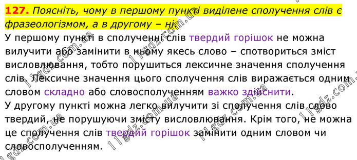 Поясніть, чому в першому пункті виділене сполучення слів є фразеологізмом, а в другому – ні. У першому пункті в сполученні слів твердий горішок не можна вилучити або замінити в ньому якесь слово – спотвориться зміст висловлювання, тобто порушиться лексичне значення сполучення слів. Лексичне значення цього сполучення слів виражається одним словом складно або словосполученням важко здійснити. У другому пункті можна легко вилучити зі сполучення слів слово твердий, не порушуючи змісту висловлювання. Крім того, не можна це сполучення слів твердий горішок замінити одним словом чи словосполученням.