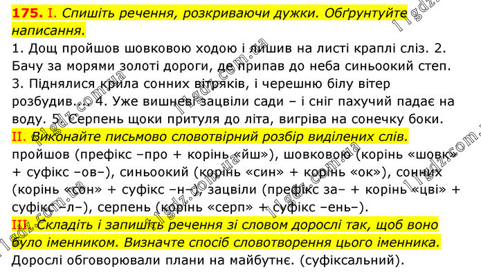 І. Спишіть речення, розкриваючи дужки. Обґрунтуйте написання. 1. Дощ пройшов шовковою ходою і лишив на листі краплі сліз. 2. Бачу за морями золоті дороги, де припав до неба синьоокий степ. 3. Піднялися крила сонних вітряків, і черешню білу вітер розбудив.... 4. Уже вишневі зацвіли сади – і сніг пахучий падає на воду. 5. Серпень щоки притуля до літа, вигріва на сонечку боки. II. Виконайте письмово словотвірний розбір виділених слів. пройшов (префікс –про + корінь «йш»), шовковою (корінь «шовк» + суфікс –ов–), синьоокий (корінь «син» + корінь «ок»), сонних (корінь «сон» + суфікс –н–), зацвіли (префікс за– + корінь «цві» + суфікс –л–), серпень (корінь «серп» + суфікс –ень–). III. Складіть і запишіть речення зі словом дорослі так, щоб воно було іменником. Визначте спосіб словотворення цього іменника. Дорослі обговорювали плани на майбутнє. (суфіксальний).