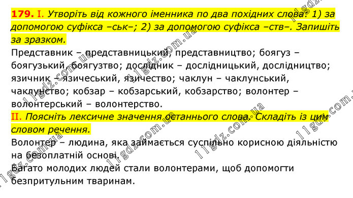 І. Утворіть від кожного іменника по два похідних слова: 1) за допомогою суфікса –ськ–; 2) за допомогою суфікса –ств–. Запишіть за зразком. Представник – представницький, представництво; боягуз – боягузький, боягузтво; дослідник – дослідницький, дослідництво; язичник – язичеський, язичество; чаклун – чаклунський, чаклунство; кобзар – кобзарський, кобзарство; волонтер – волонтерський – волонтерство. II. Поясніть лексичне значення останнього слова. Складіть із цим словом речення. Волонтер – людина, яка займається суспільно корисною діяльністю на безоплатній основі. Багато молодих людей стали волонтерами, щоб допомогти безпритульним тваринам.