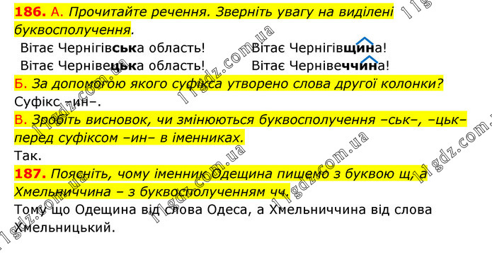 А. Прочитайте речення. Зверніть увагу на виділені буквосполучення. Вітає Чернігівська область! Вітає Чернівецька область! Вітає Чернігівщина! Вітає Чернівеччина! Б. За допомогою якого суфікса утворено слова другої колонки? Суфікс –ин–. В. Зробіть висновок, чи змінюються буквосполучення –ськ–, –цьк– перед суфіксом –ин– в іменниках. Так. 187. Поясніть, чому іменник Одещина пишемо з буквою щ, а Хмельниччина – з буквосполученням чч. Тому що Одещина від слова Одеса, а Хмельниччина від слова Хмельницький.