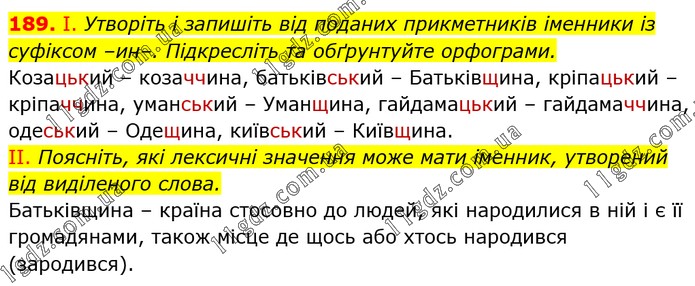 І. Утворіть і запишіть від поданих прикметників іменники із суфіксом –ин–. Підкресліть та обґрунтуйте орфограми. Козацький – козаччина, батьківський – Батьківщина, кріпацький – кріпаччина, уманський – Уманщина, гайдамацький – гайдамаччина, одеський – Одещина, київський – Київщина. II. Поясніть, які лексичні значення може мати іменник, утворений від виділеного слова. Батьківщина – країна стосовно до людей, які народилися в ній і є її громадянами, також місце де щось або хтось народився (зародився).
