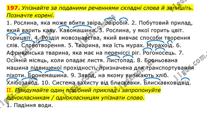 Упізнайте за поданими реченнями складні слова й запишіть. Позначте корені. 1. Рослина, яка може вбити звіра. Звіробій. 2. Побутовий прилад, який варить каву. Кавомашина. 3. Рослина, у якої горить цвіт. Горицвіт. 4. Розділ мовознавства, який вивчає способи творення слів. Словотворення. 5. Тварина, яка їсть мурах. Мурахоїд. 6. Африканська тварина, яка має на переніссі ріг. Рогоносець. 7. Осінній місяць, коли опадає листя. Листопад. 8. Броньована машина підвищеної прохідності, призначена для транспортування піхоти. Бронемашина. 9. Завод, на якому випікають хліб. Хлібозавод. 10. Система захисту від блискавки. Блискавковідвід. II. Придумайте один подібний приклад і запропонуйте однокласникам / однокласницям упізнати слово. 1. Падіння води.