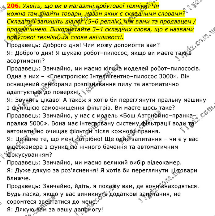 Уявіть, що ви в магазині побутової техніки. Чи можна там знайти товари, назви яких є складними словами? Складіть і запишіть діалог (5–6 реплік) між вами та продавцем / продавчинею. Використайте 3–4 складних слова, що є назвами побутової техніки, та слова ввічливості. Продавець: Доброго дня! Чим можу допомогти вам? Я: Доброго дня! Я шукаю робот–пилосос, якщо ви маєте такі в асортименті? Продавець: Звичайно, ми маємо кілька моделей робот–пилососів. Одна з них – «Електролюкс Інтеллігентно–пилосос 3000». Він оснащений сенсорами розпізнавання пилу та автоматично адаптується до поверхні. Я: Звучить цікаво! А також я хотів би переглянути пральну машину з функцією самоочищення фільтрів. Ви маєте щось таке? Продавець: Звичайно, у нас є модель «Бош Автономно–пранка–пралка 5000». Вона має інтегровану систему фільтрації води та автоматично очищає фільтри після кожного прання. Я: Це саме те, що мені потрібно! Ще одне запитання – чи є у вас відеокамера з функцією нічного бачення та автоматичним фокусуванням? Продавець: Звичайно, ми маємо великий вибір відеокамер. Я: Дуже дякую за роз'яснення! Я хотів би переглянути ці товари ближче. Продавець: Звичайно, йдіть, я покажу вам, де вони знаходяться. Будь ласка, якщо у вас виникнуть додаткові запитання, не соромтеся звертатися до мене. Я: Дякую вам за вашу допомогу!
