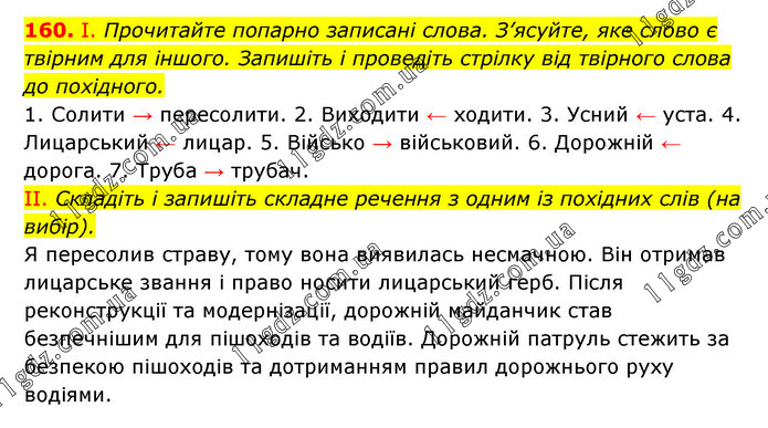 І. Прочитайте попарно записані слова. З’ясуйте, яке слово є твірним для іншого. Запишіть і проведіть стрілку від твірного слова до похідного. 1. Солити → пересолити. 2. Виходити ← ходити. 3. Усний ← уста. 4. Лицарський ← лицар. 5. Військо → військовий. 6. Дорожній ← дорога. 7. Труба → трубач. II. Складіть і запишіть складне речення з одним із похідних слів (на вибір). Я пересолив страву, тому вона виявилась несмачною. Він отримав лицарське звання і право носити лицарський герб. Після реконструкції та модернізації, дорожній майданчик став безпечнішим для пішоходів та водіїв. Дорожній патруль стежить за безпекою пішоходів та дотриманням правил дорожнього руху водіями.