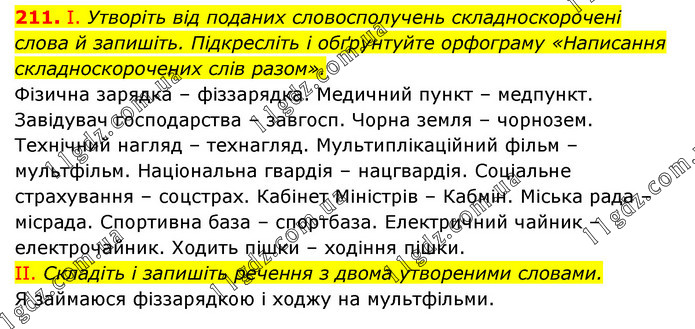 І. Утворіть від поданих словосполучень складноскорочені слова й запишіть. Підкресліть і обґрунтуйте орфограму «Написання складноскорочених слів разом». Фізична зарядка – фіззарядка. Медичний пункт – медпункт. Завідувач господарства – завгосп. Чорна земля – чорнозем. Технічний нагляд – технагляд. Мультиплікаційний фільм – мультфільм. Національна гвардія – нацгвардія. Соціальне страхування – соцстрах. Кабінет Міністрів – Кабмін. Міська рада – місрада. Спортивна база – спортбаза. Електричний чайник – електрочайник. Ходить пішки – ходіння пішки. II. Складіть і запишіть речення з двома утвореними словами. Я займаюся фіззарядкою і ходжу на мультфільми.