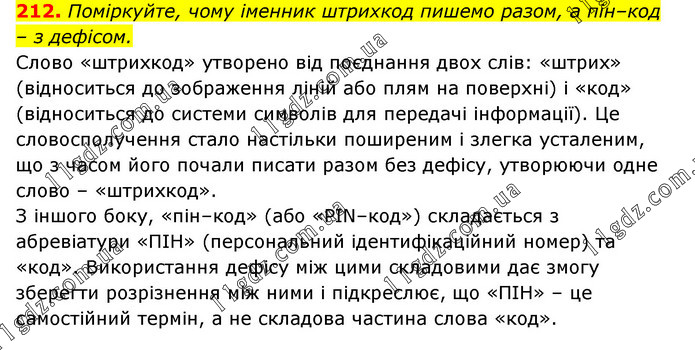 Поміркуйте, чому іменник штрихкод пишемо разом, а пін–код – з дефісом. Слово «штрихкод» утворено від поєднання двох слів: «штрих» (відноситься до зображення ліній або плям на поверхні) і «код» (відноситься до системи символів для передачі інформації). Це словосполучення стало настільки поширеним і злегка усталеним, що з часом його почали писати разом без дефісу, утворюючи одне слово – «штрихкод». З іншого боку, «пін–код» (або «PIN–код») складається з абревіатури «ПІН» (персональний ідентифікаційний номер) та «код». Використання дефісу між цими складовими дає змогу зберегти розрізнення між ними і підкреслює, що «ПІН» – це самостійний термін, а не складова частина слова «код».
