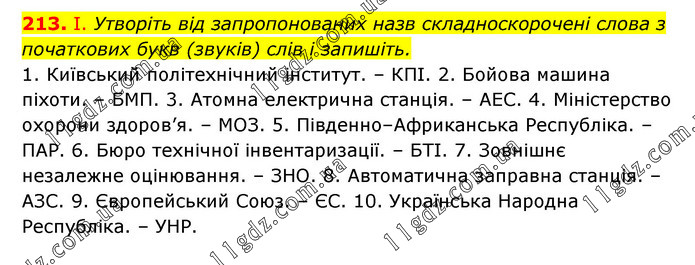 І. Утворіть від запропонованих назв складноскорочені слова з початкових букв (звуків) слів і запишіть. 1. Київський політехнічний інститут. – КПІ. 2. Бойова машина піхоти. – БМП. 3. Атомна електрична станція. – АЕС. 4. Міністерство охорони здоров’я. – МОЗ. 5. Південно–Африканська Республіка. – ПАР. 6. Бюро технічної інвентаризації. – БТІ. 7. Зовнішнє незалежне оцінювання. – ЗНО. 8. Автоматична заправна станція. – АЗС. 9. Європейський Союз. – ЄС. 10. Українська Народна Республіка. – УНР.