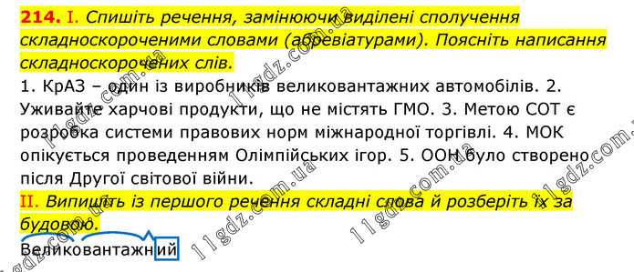 І. Спишіть речення, замінюючи виділені сполучення складноскороченими словами (абревіатурами). Поясніть написання складноскорочених слів. 1. КрАЗ – один із виробників великовантажних автомобілів. 2. Уживайте харчові продукти, що не містять ГМО. 3. Метою СОТ є розробка системи правових норм міжнародної торгівлі. 4. МОК опікується проведенням Олімпійських ігор. 5. ООН було створено після Другої світової війни. II. Випишіть із першого речення складні слова й розберіть їх за будовою. Великовантажний