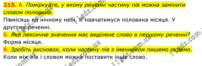 А. Поміркуйте, у якому реченні частину пів можна замінити словом половина. Півмісяць на нічному небі. Я навчатимуся половина місяця. У другому реченні. Б. Яке лексичне значення має виділене слово в першому реченні? Форма місяця. В. Зробіть висновок, коли частину пів з іменником пишемо окремо. Коли між пів і словом можна поставити інше слово.