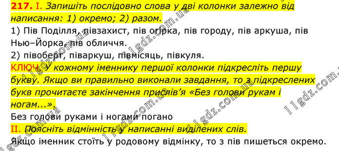 І. Запишіть послідовно слова у дві колонки залежно від написання: 1) окремо; 2) разом. 1) Пів Поділля, півзахист, пів огірка, пів городу, пів аркуша, пів Нью–Йорка, пів обличчя. 2) півоберт, піваркуш, півмісяць, півкуля. КЛЮЧ. У кожному іменнику першої колонки підкресліть першу букву. Якщо ви правильно виконали завдання, то з підкреслених букв прочитаєте закінчення прислів’я «Без голови рукам і ногам...». Без голови руками і ногами погано II. Поясніть відмінність у написанні виділених слів. Якщо іменник стоїть у родовому відмінку, то з пів пишеться окремо.