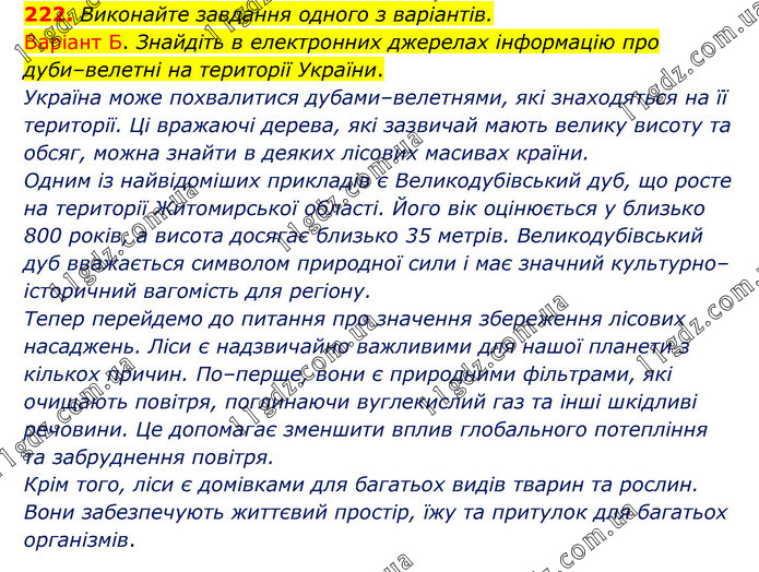 Виконайте завдання одного з варіантів. Варіант Б. Знайдіть в електронних джерелах інформацію про дуби–велетні на території України. Україна може похвалитися дубами–велетнями, які знаходяться на її території. Ці вражаючі дерева, які зазвичай мають велику висоту та обсяг, можна знайти в деяких лісових масивах країни. Одним із найвідоміших прикладів є Великодубівський дуб, що росте на території Житомирської області. Його вік оцінюється у близько 800 років, а висота досягає близько 35 метрів. Великодубівський дуб вважається символом природної сили і має значний культурно–історичний вагомість для регіону. Тепер перейдемо до питання про значення збереження лісових насаджень. Ліси є надзвичайно важливими для нашої планети з кількох причин. По–перше, вони є природними фільтрами, які очищають повітря, поглинаючи вуглекислий газ та інші шкідливі речовини. Це допомагає зменшити вплив глобального потепління та забруднення повітря. Крім того, ліси є домівками для багатьох видів тварин та рослин. Вони забезпечують життєвий простір, їжу та притулок для багатьох організмів.