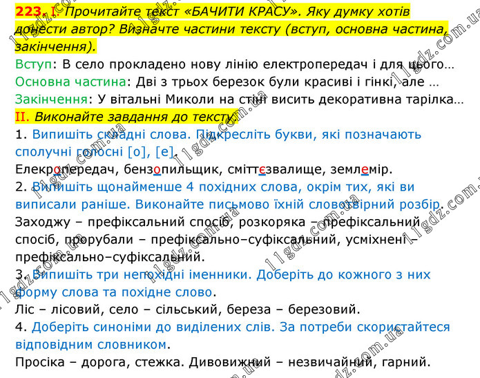 І. Прочитайте текст «БАЧИТИ КРАСУ». Яку думку хотів донести автор? Визначте частини тексту (вступ, основна частина, закінчення). Вступ: В село прокладено нову лінію електропередач і для цього… Основна частина: Дві з трьох березок були красиві і гінкі, але … Закінчення: У вітальні Миколи на стіні висить декоративна тарілка… II. Виконайте завдання до тексту. 1. Випишіть складні слова. Підкресліть букви, які позначають сполучні голосні [о], [е]. Елекропередач, бензопильщик, сміттєзвалище, землемір. 2. Випишіть щонайменше 4 похідних слова, окрім тих, які ви виписали раніше. Виконайте письмово їхній словотвірний розбір. Заходжу – префіксальний спосіб, розкоряка – префіксальний спосіб, прорубали – префіксально–суфіксальний, усміхнені – префіксально–суфіксальний. 3. Випишіть три непохідні іменники. Доберіть до кожного з них форму слова та похідне слово. Ліс – лісовий, село – сільський, береза – березовий. 4. Доберіть синоніми до виділених слів. За потреби скористайтеся відповідним словником. Просіка – дорога, стежка. Дивовижний – незвичайний, гарний.
