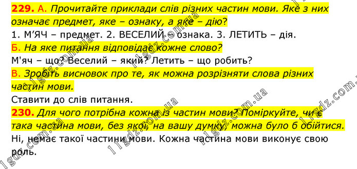229. А. Прочитайте приклади слів різних частин мови. Яке з них означає предмет, яке – ознаку, а яке – дію? 1. М’ЯЧ – предмет. 2. ВЕСЕЛИЙ – ознака. 3. ЛЕТИТЬ – дія. Б. На яке питання відповідає кожне слово? М'яч – що? Веселий – який? Летить – що робить? В. Зробіть висновок про те, як можна розрізняти слова різних частин мови. Ставити до слів питання. 230. Для чого потрібна кожна із частин мови? Поміркуйте, чи є така частина мови, без якої, на вашу думку, можна було б обійтися. Ні, немає такої частини мови. Кожна частина мови виконує свою роль.