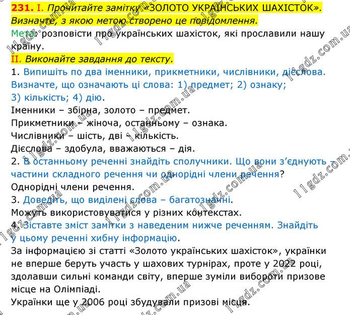 І. Прочитайте замітку «ЗОЛОТО УКРАЇНСЬКИХ ШАХІСТОК». Визначте, з якою метою створено це повідомлення. Мета: розповісти про українських шахісток, які прославили нашу країну. II. Виконайте завдання до тексту. 1. Випишіть по два іменники, прикметники, числівники, дієслова. Визначте, що означають ці слова: 1) предмет; 2) ознаку; 3) кількість; 4) дію. Іменники – збірна, золото – предмет. Прикметники – жіноча, останньому – ознака. Числівники – шість, дві – кількість. Дієслова – здобула, вважаються – дія. 2. В останньому реченні знайдіть сполучники. Що вони з’єднують – частини складного речення чи однорідні члени речення? Однорідні члени речення. 3. Доведіть, що виділені слова – багатозначні. Можуть використовуватися у різних контекстах. 4. Зіставте зміст замітки з наведеним нижче реченням. Знайдіть у цьому реченні хибну інформацію. За інформацією зі статті «Золото українських шахісток», українки не вперше беруть участь у шахових турнірах, проте у 2022 році, здолавши сильні команди світу, вперше зуміли вибороти призове місце на Олімпіаді. Українки ще у 2006 році збудували призові місця.