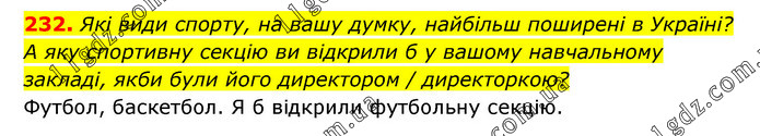 Які види спорту, на вашу думку, найбільш поширені в Україні? А яку спортивну секцію ви відкрили б у вашому навчальному закладі, якби були його директором / директоркою? Футбол, баскетбол. Я б відкрили футбольну секцію.