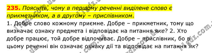 Поясніть, чому в першому реченні виділене слово є прикметником, а в другому – прислівником. 1. Добре слово кожному приємне. Добре – прикметник, тому що визначає ознаку предмета і відповідає на питання яке? 2. Хто добре працює, той добре відпочиває. Добре – прислівник, бо в цьому реченні він означає ознаку дії та відповідає на питання як?