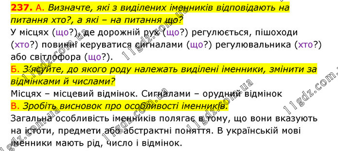 А. Визначте, які з виділених іменників відповідають на питання хто?, а які – на питання що? У місцях (що?), де дорожній рух (що?) регулюється, пішоходи (хто?) повинні керуватися сигналами (що?) регулювальника (хто?) або світлофора (що?). Б. З’ясуйте, до якого роду належать виділені іменники, змінити за відмінками й числами? Місцях – місцевий відмінок. Сигналами – орудний відмінок В. Зробіть висновок про особливості іменників. Загальна особливість іменників полягає в тому, що вони вказують на істоти, предмети або абстрактні поняття. В українській мові іменники мають рід, число і відмінок.