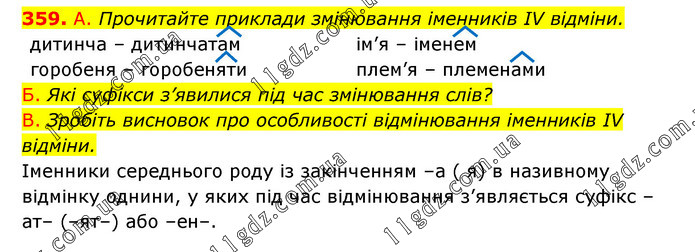 А. Прочитайте приклади змінювання іменників IV відміни. дитинча – дитинчатам горобеня – горобеняти ім’я – іменем плем’я – племенами Б. Які суфікси з’явилися під час змінювання слів? В. Зробіть висновок про особливості відмінювання іменників IV відміни. Іменники середнього роду із закінченням –а ( я) в називному відмінку однини, у яких під час відмінювання з’являється суфікс –ат– (–ят–) або –ен–.