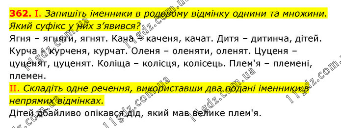 І. Запишіть іменники в родовому відмінку однини та множини. Який суфікс у них з’явився? Ягня – ягняти, ягнят. Кача – каченя, качат. Дитя – дитинча, дітей. Курча – курченя, курчат. Оленя – оленяти, оленят. Цуценя – цуценят, цуценят. Коліща – колісця, колісець. Плем'я – племені, племен. II. Складіть одне речення, використавши два подані іменники в непрямих відмінках. Дітей дбайливо опікався дід, який мав велике плем'я.