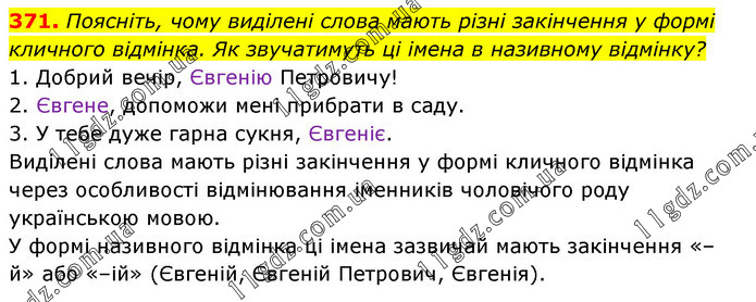 Поясніть, чому виділені слова мають різні закінчення у формі кличного відмінка. Як звучатимуть ці імена в називному відмінку? 1. Добрий вечір, Євгенію Петровичу! 2. Євгене, допоможи мені прибрати в саду. 3. У тебе дуже гарна сукня, Євгеніє. Виділені слова мають різні закінчення у формі кличного відмінка через особливості відмінювання іменників чоловічого роду українською мовою. У формі називного відмінка ці імена зазвичай мають закінчення «–й» або «–ій» (Євгеній, Євгеній Петрович, Євгенія).