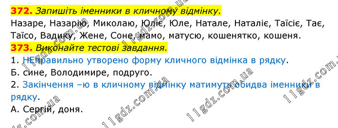 372. Запишіть іменники в кличному відмінку. Назаре, Назарію, Миколаю, Юліє, Юле, Натале, Наталіє, Таїсіє, Тає, Таїсо, Вадику, Жене, Соне, мамо, матусю, кошенятко, кошеня. 373. Виконайте тестові завдання. 1. НЕправильно утворено форму кличного відмінка в рядку. Б. сине, Володимире, подруго. 2. Закінчення –ю в кличному відмінку матимуть обидва іменники в рядку. А. Сергій, доня.