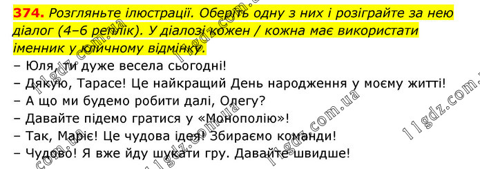 Розгляньте ілюстрації. Оберіть одну з них і розіграйте за нею діалог (4–6 реплік). У діалозі кожен / кожна має використати іменник у кличному відмінку. – Юля, ти дуже весела сьогодні! – Дякую, Тарасе! Це найкращий День народження у моєму житті! – А що ми будемо робити далі, Олегу? – Давайте підемо гратися у «Монополію»! – Так, Маріє! Це чудова ідея! Збираємо команди! – Чудово! Я вже йду шукати гру. Давайте швидше!