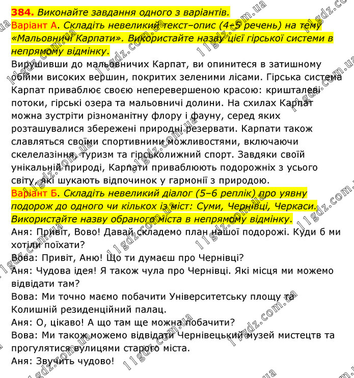 Виконайте завдання одного з варіантів. Варіант А. Складіть невеликий текст–опис (4–5 речень) на тему «Мальовничі Карпати». Використайте назву цієї гірської системи в непрямому відмінку. Вирушивши до мальовничих Карпат, ви опинитеся в затишному обійми високих вершин, покритих зеленими лісами. Гірська система Карпат приваблює своєю неперевершеною красою: кришталеві потоки, гірські озера та мальовничі долини. На схилах Карпат можна зустріти різноманітну флору і фауну, серед яких розташувалися збережені природні резервати. Карпати також славляться своїми спортивними можливостями, включаючи скелелазіння, туризм та гірськолижний спорт. Завдяки своїй унікальній природі, Карпати приваблюють подорожніх з усього світу, які шукають відпочинок у гармонії з природою. Варіант Б. Складіть невеликий діалог (5–6 реплік) про уявну подорож до одного чи кількох із міст: Суми, Чернівці, Черкаси. Використайте назву обраного міста в непрямому відмінку. Аня: Привіт, Вово! Давай складемо план нашої подорожі. Куди б ми хотіли поїхати? Вова: Привіт, Аню! Що ти думаєш про Чернівці? Аня: Чудова ідея! Я також чула про Чернівці. Які місця ми можемо відвідати там? Вова: Ми точно маємо побачити Університетську площу та Колишній резиденційний палац. Аня: О, цікаво! А що там ще можна побачити? Вова: Ми також можемо відвідати Чернівецький музей мистецтв та прогулятися вулицями старого міста. Аня: Звучить чудово!